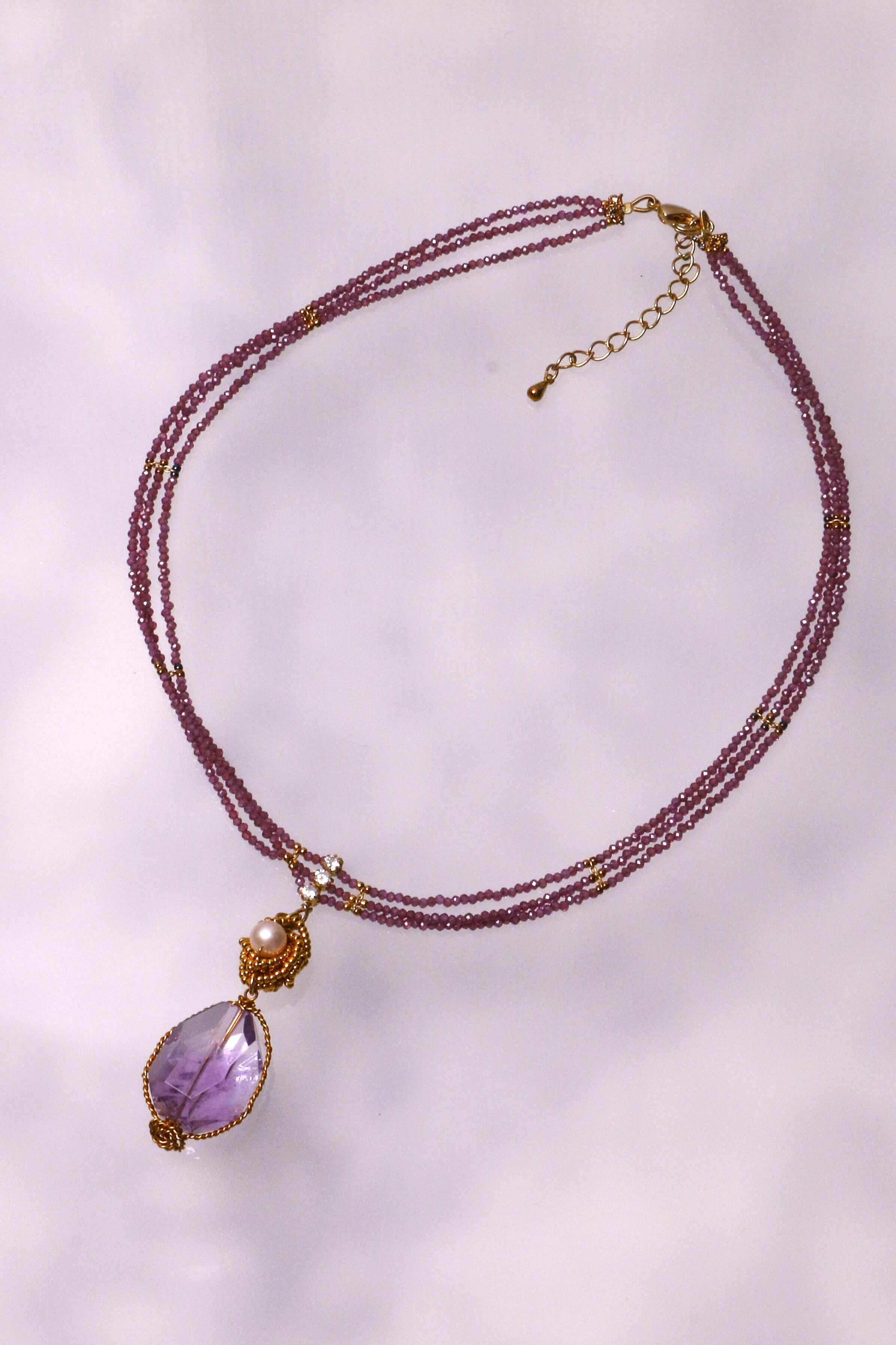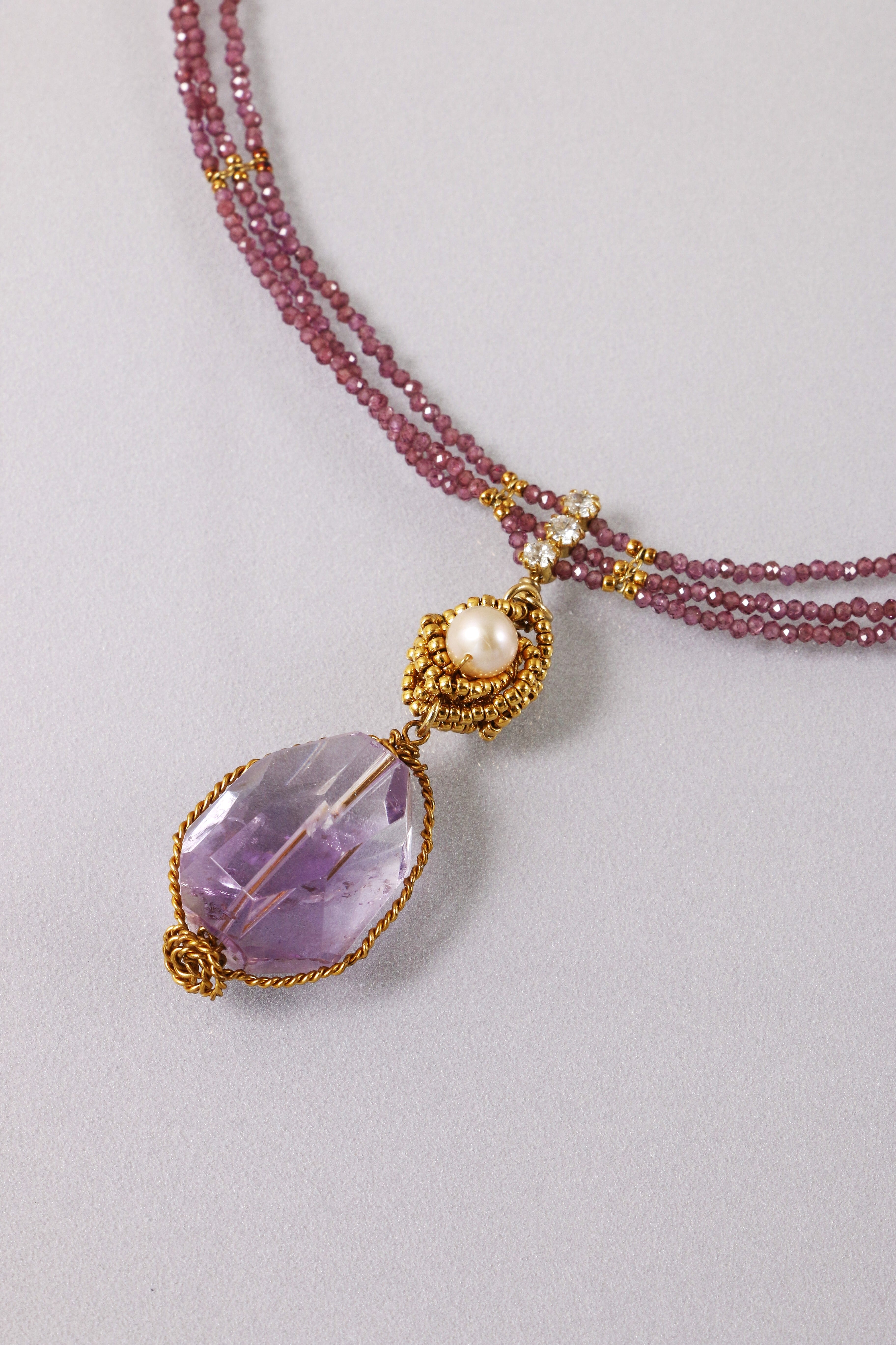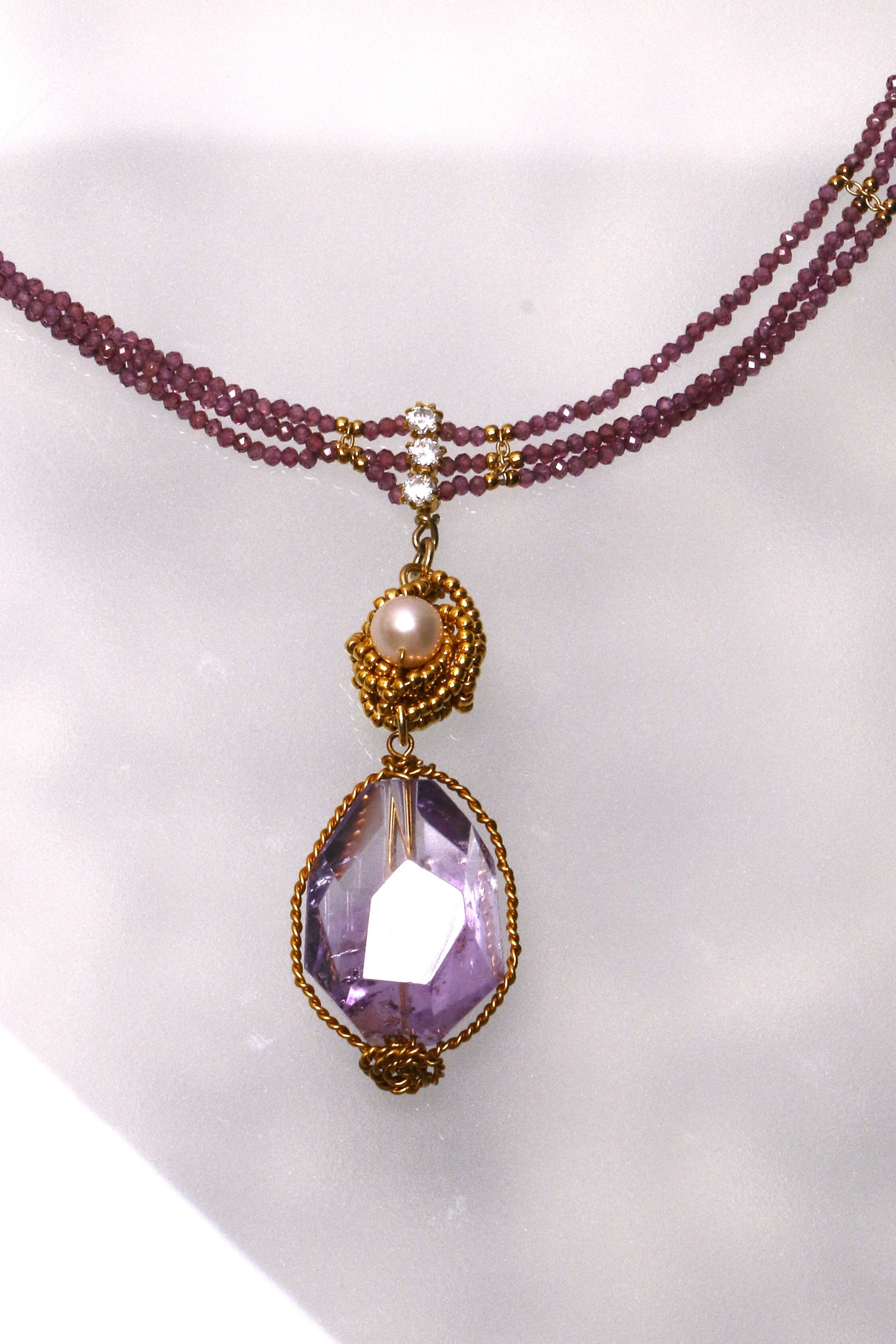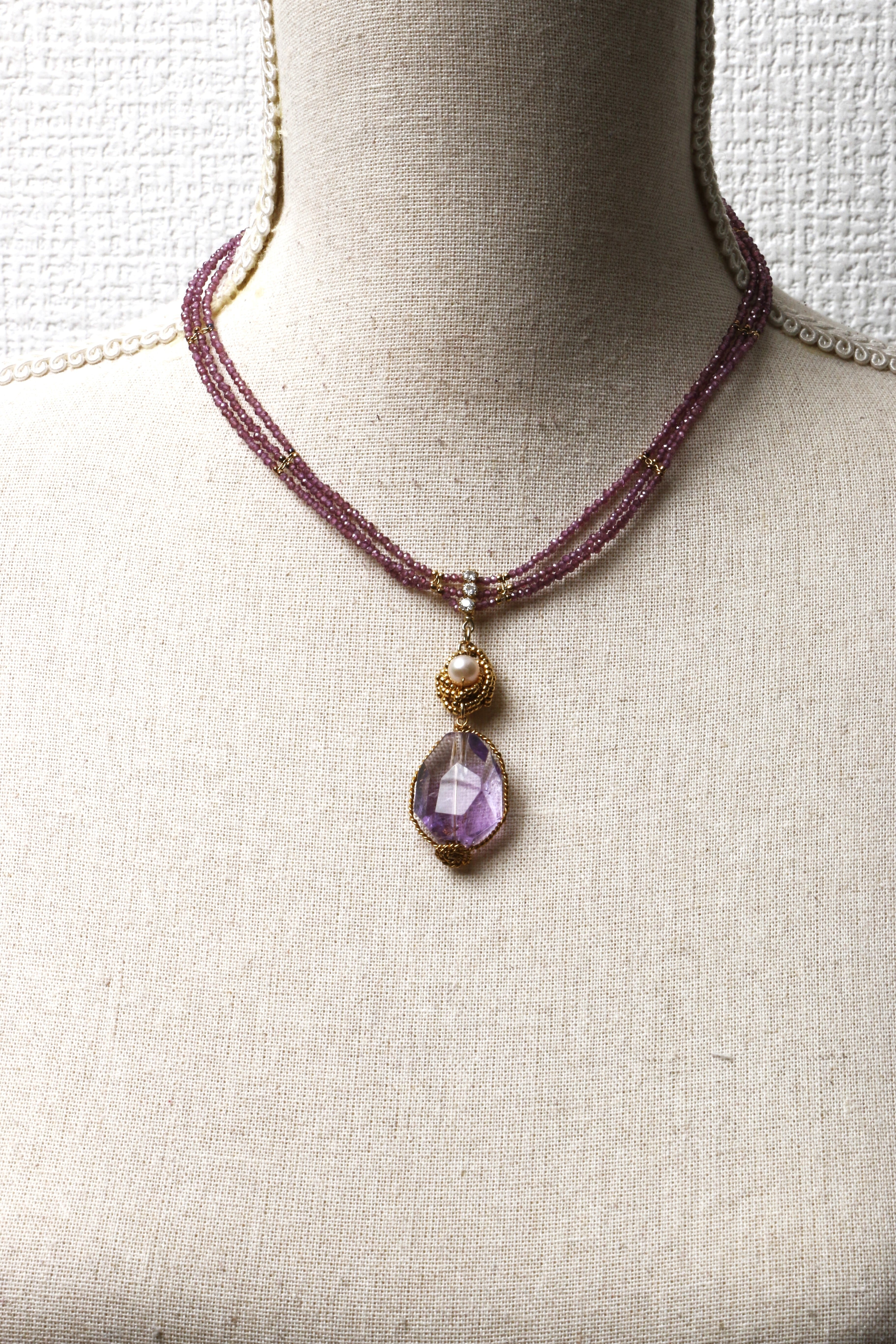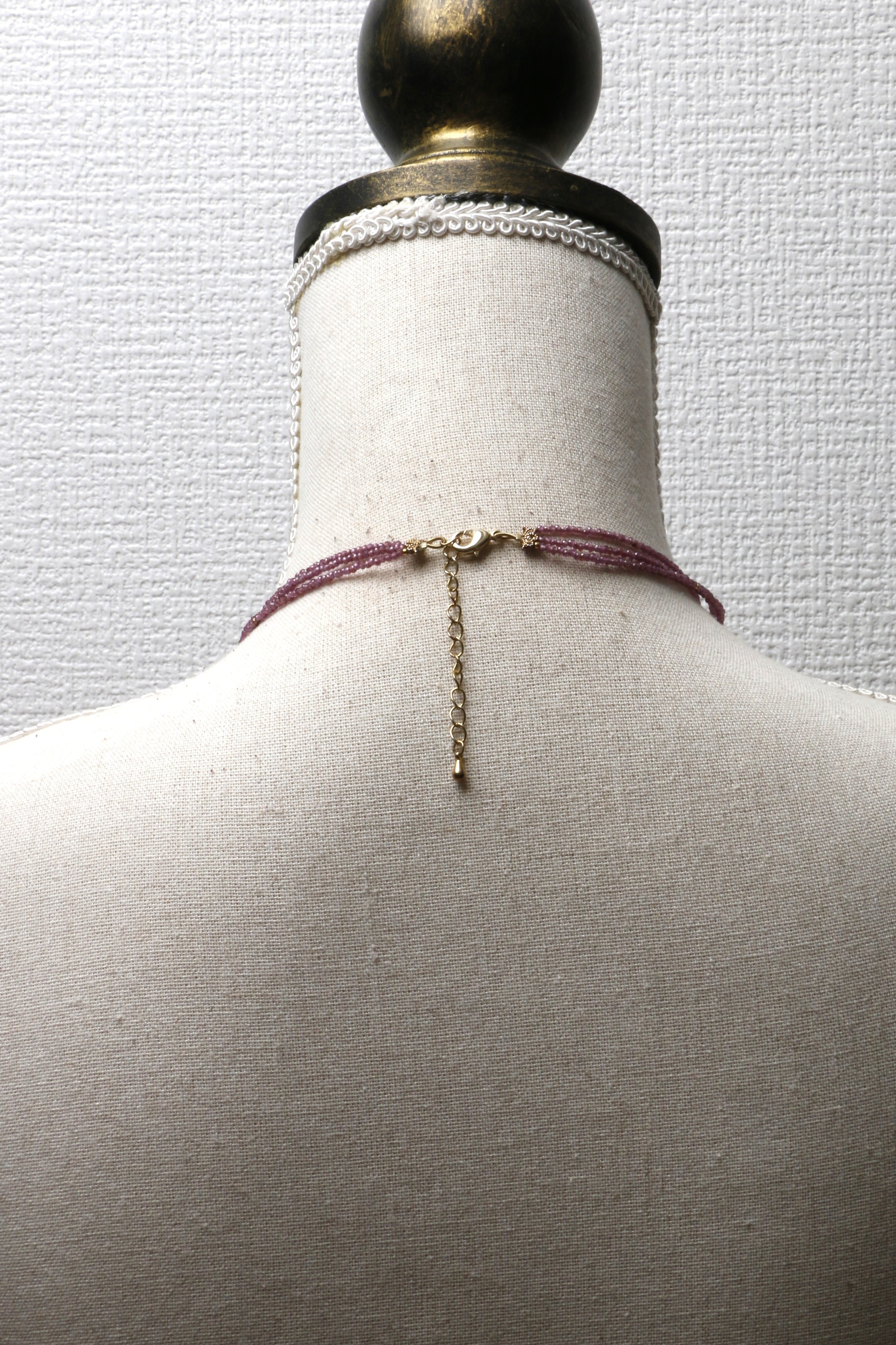 ネックレス部分は、カットの入った2mmのガーネットを三連に仕立て、